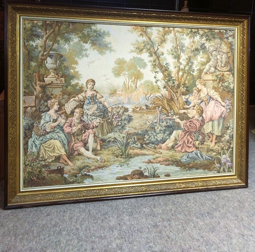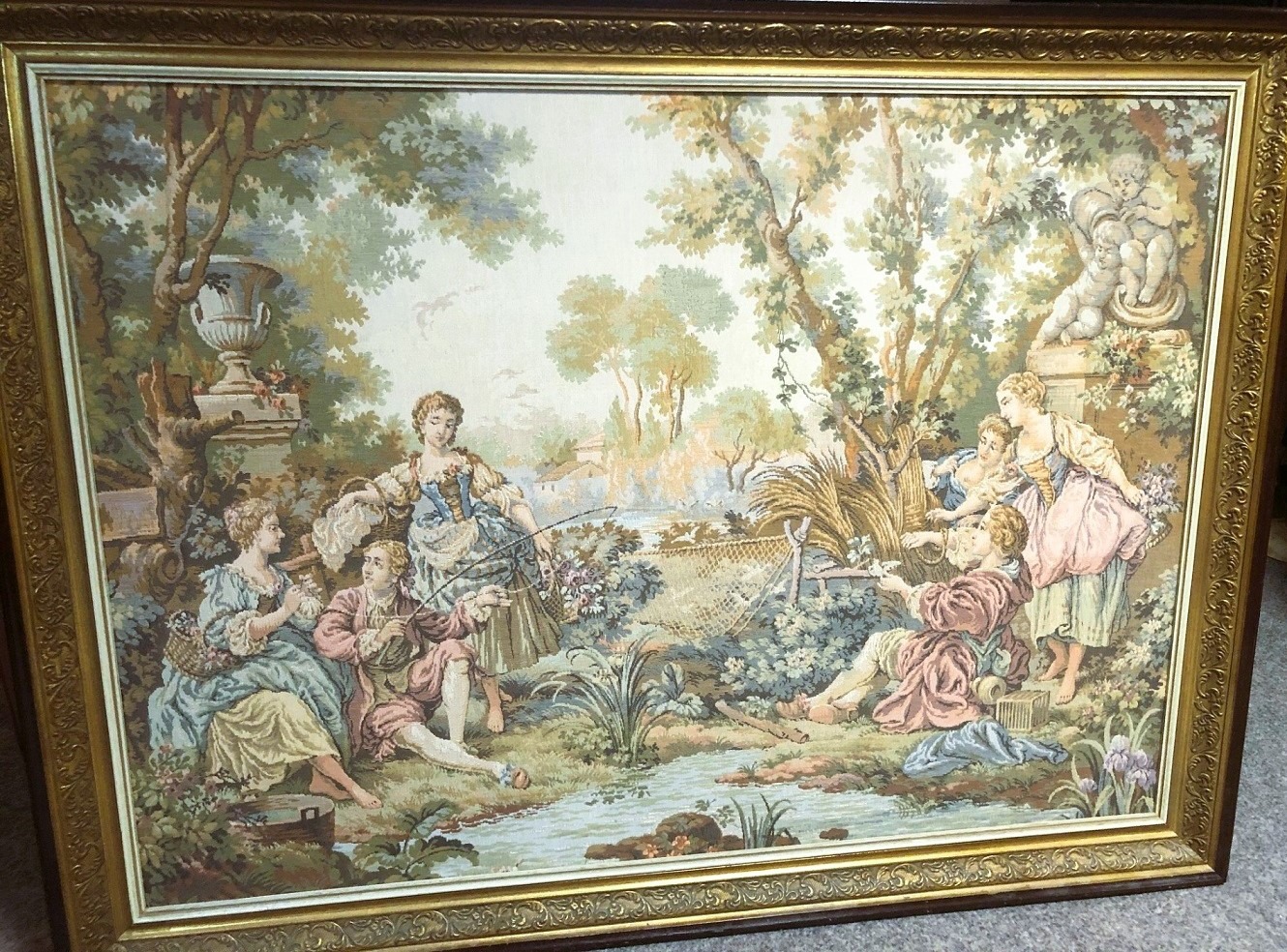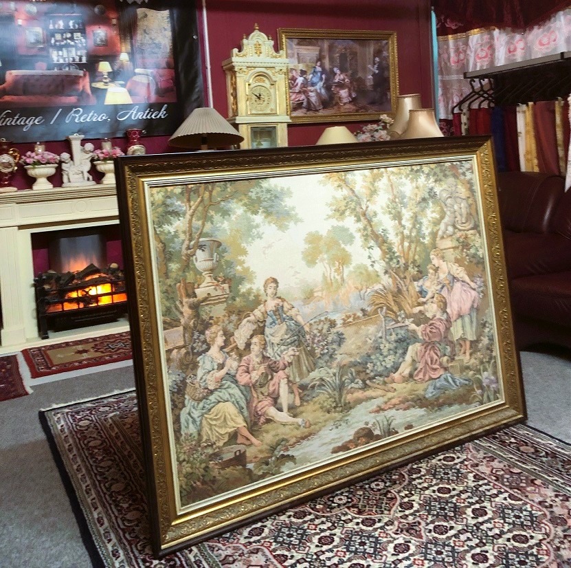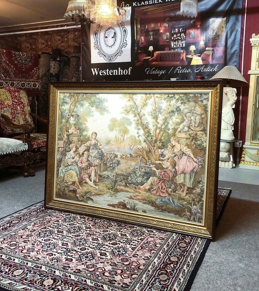 Prachtige antiek groot en zware schilderij Rococo barok geborduurd met klassiek lijst goud.