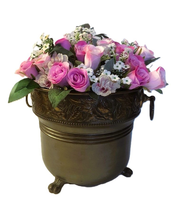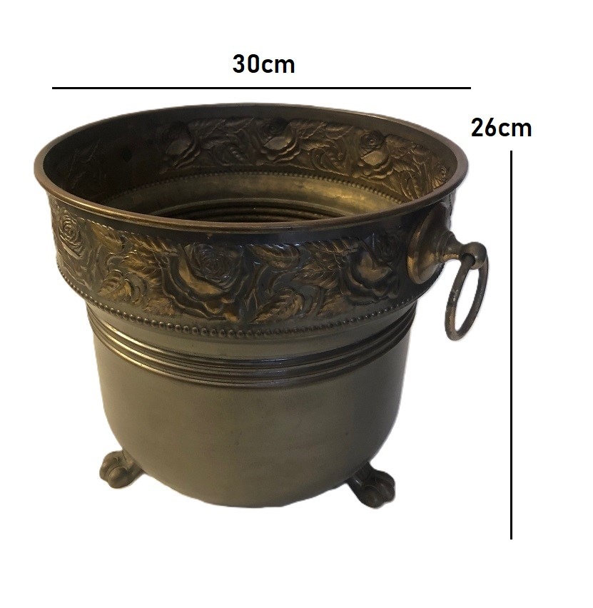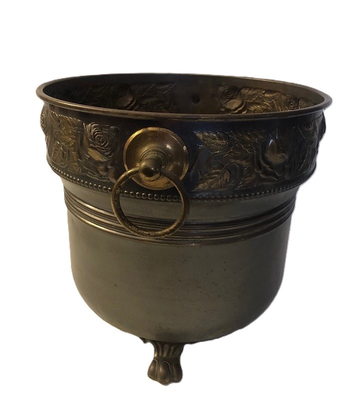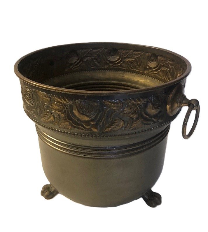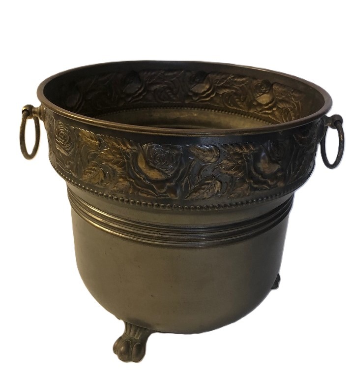 Mooie antiek, grote bloempot met oren van koper bronskleurig met rozen / bloemen relief. Afmetingen: dia. 30 cm, hoogte 26 cm. Let op: kunstbleoemen niet inclusief.