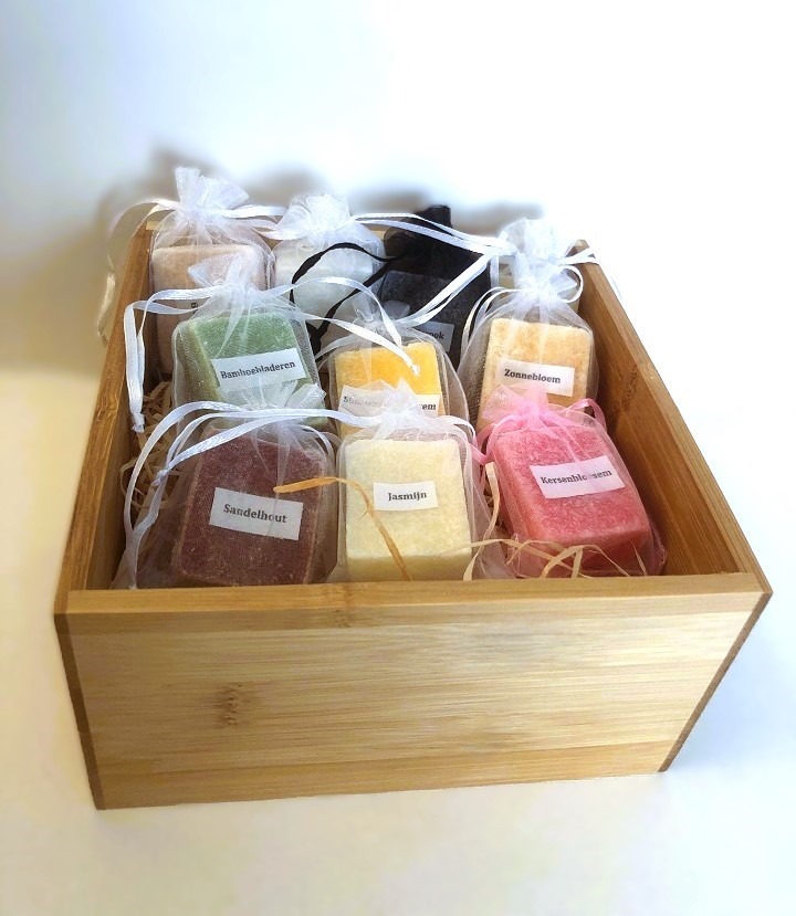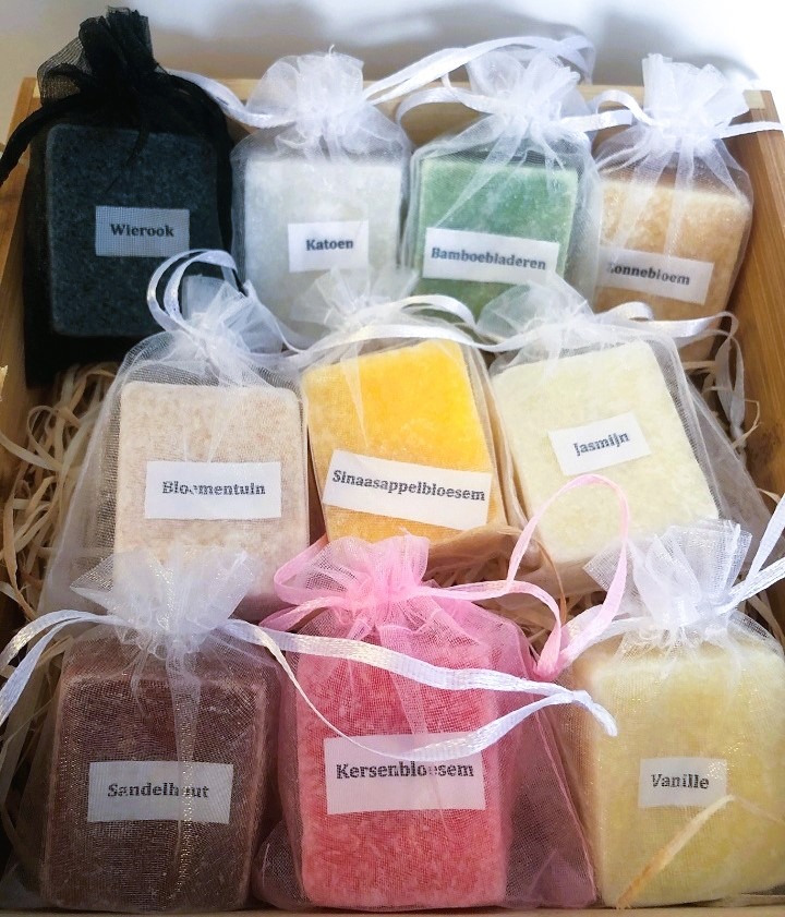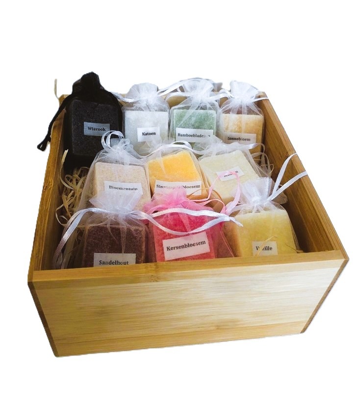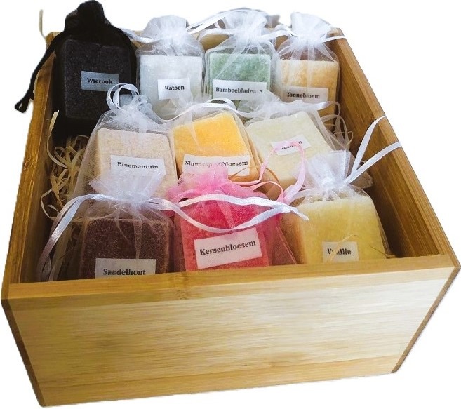 Het totaal 10 st. in bamboemand, ze zijn ook geschikt voor decoratie of cadeau gelegenheden met verschillende geurblokjes van: