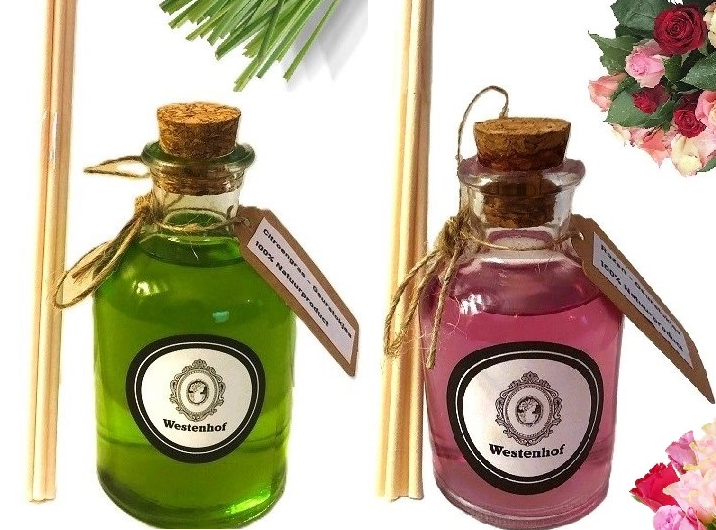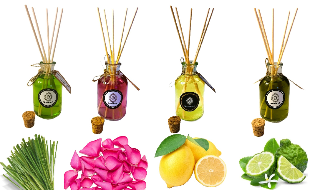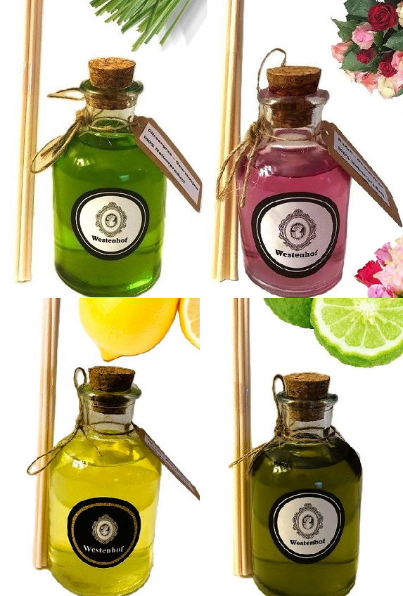 Westenhof aroma 4x geurstokjes - citroengras - rozen - citroen - bergamot - 60ml x4 - 100% van natuurproducten.