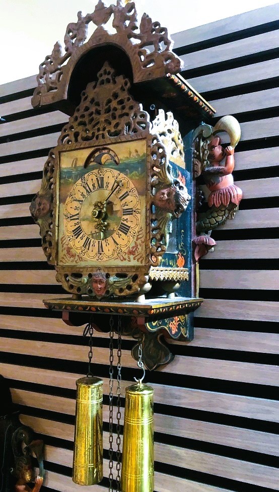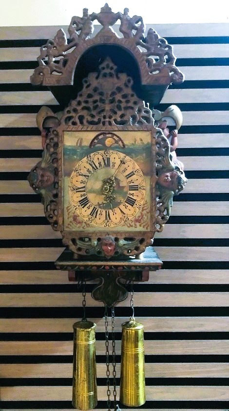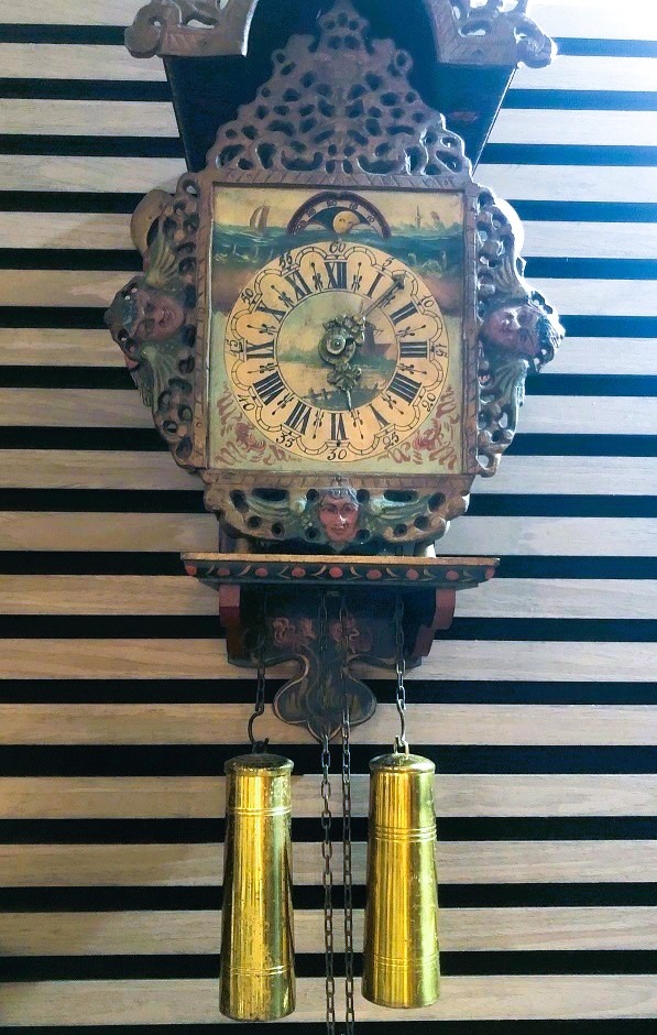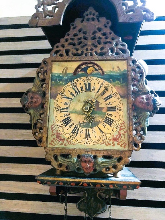 Mooie antieke wandklok - Friese stoelklok - klok met zeemeerminnen en 2 gewichten, deze klok is geschikt voor verzameling / decoratie en ook voor klussen / hobby.