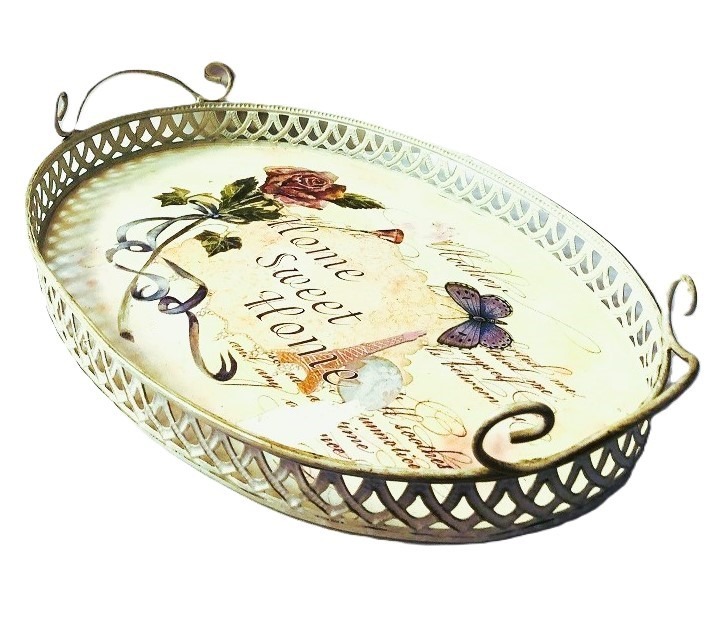 Vintage brocante dienblad roos / bloem - 41x27cm - crème