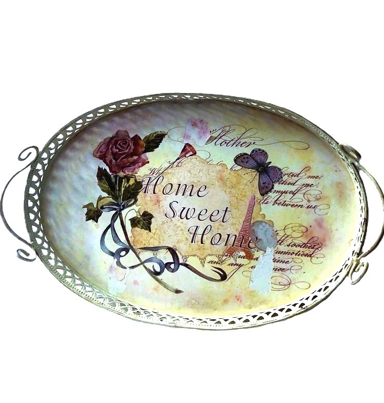 Vintage brocante dienblad met roos / bloem. Materiaal: metaal.