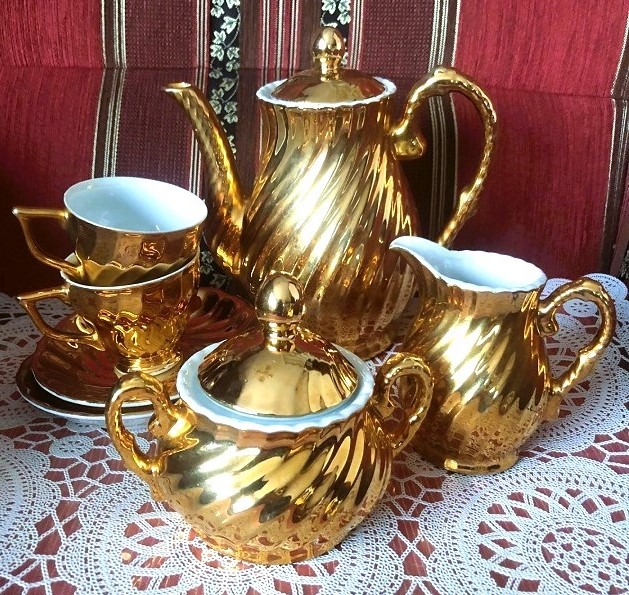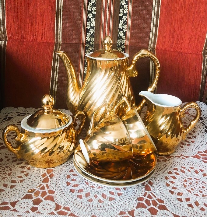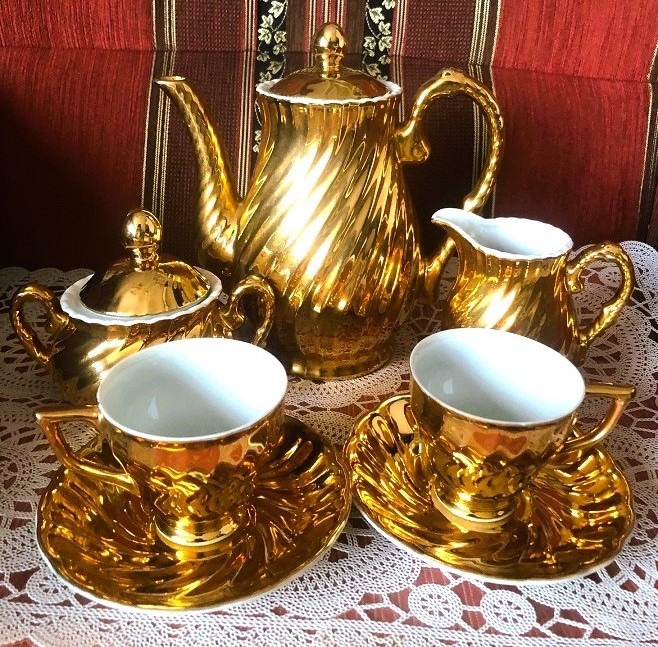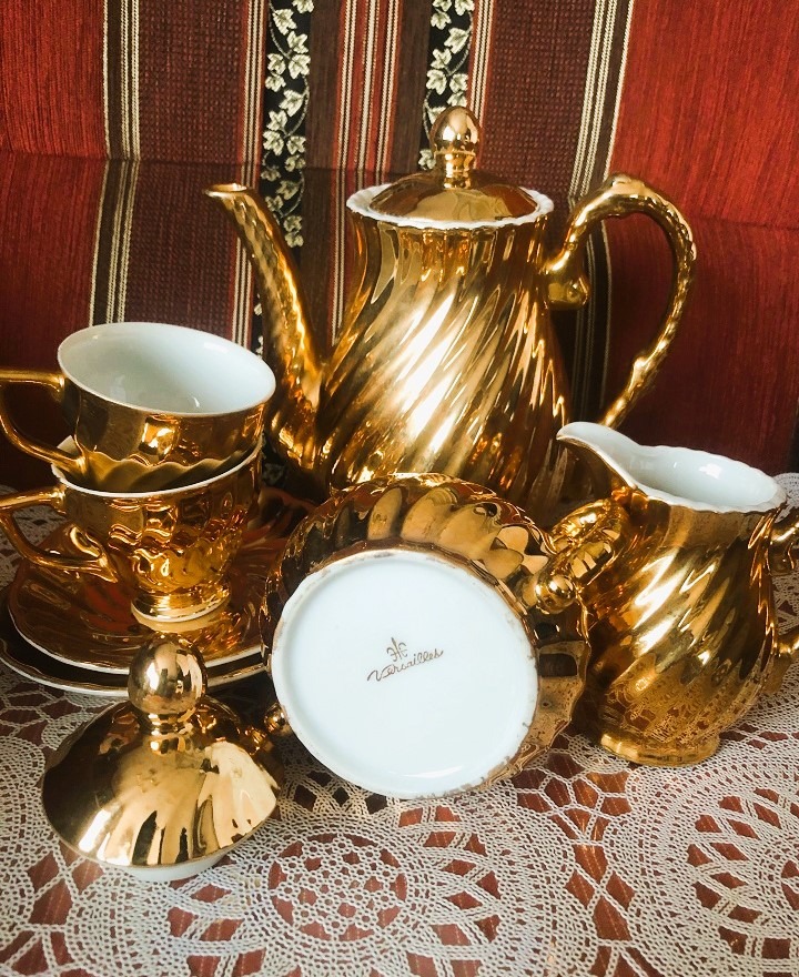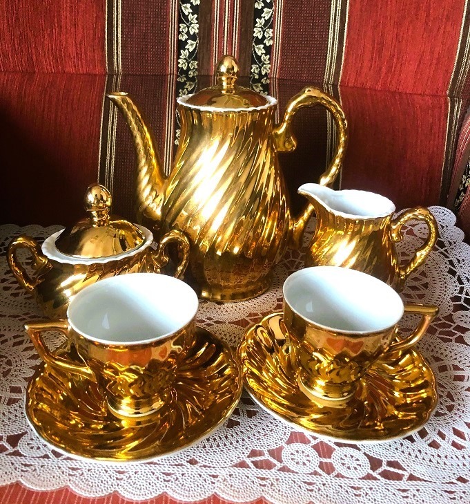 Mooie set retro / antiek gemerkt mokka servies porselein 22k goudkleurig voor verzameling / decoratie. Conditie: ze zijn in goede staat.