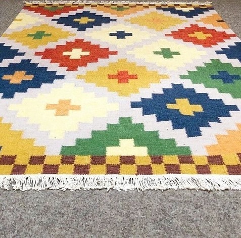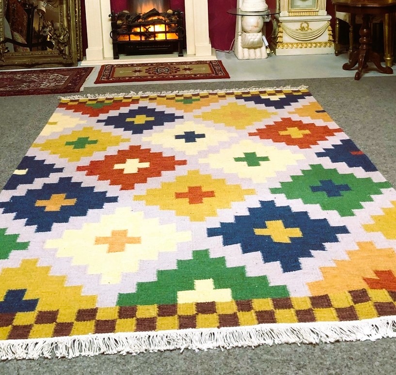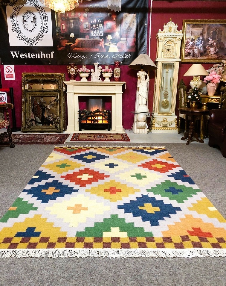Deze kelim vloerkleed patroon met diversiteit kleuren, hij is geschikt ook voor een modern interieur. Conditie: in zeer goede staat / zo goed als nieuw. Maat: LxB= 257x175cm. Deze tapijt wordt afgeleverd met certificaat van echtheid.