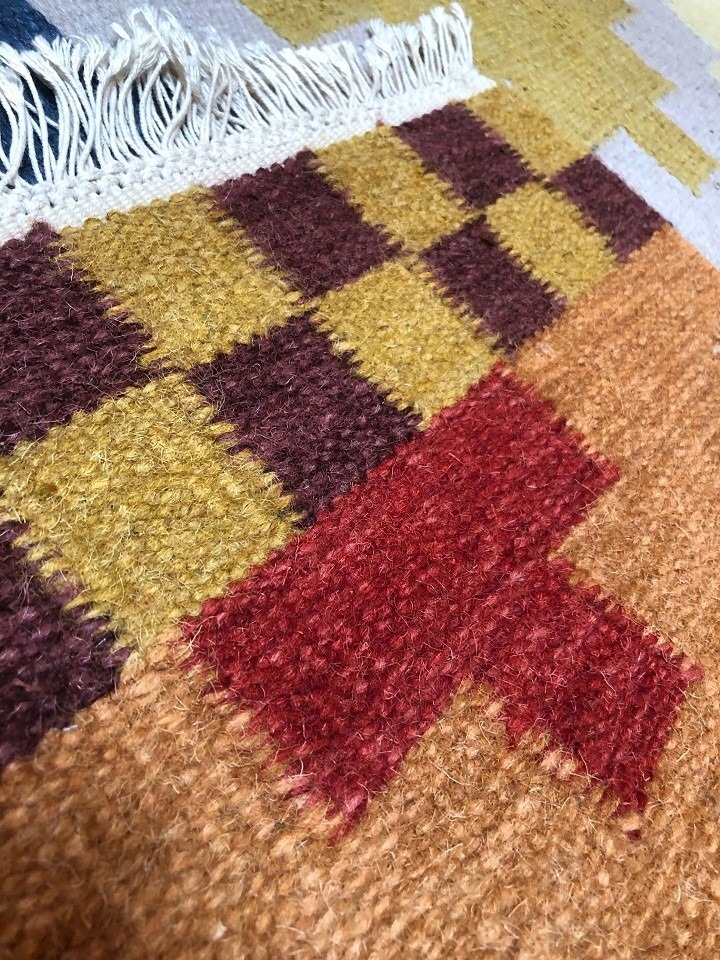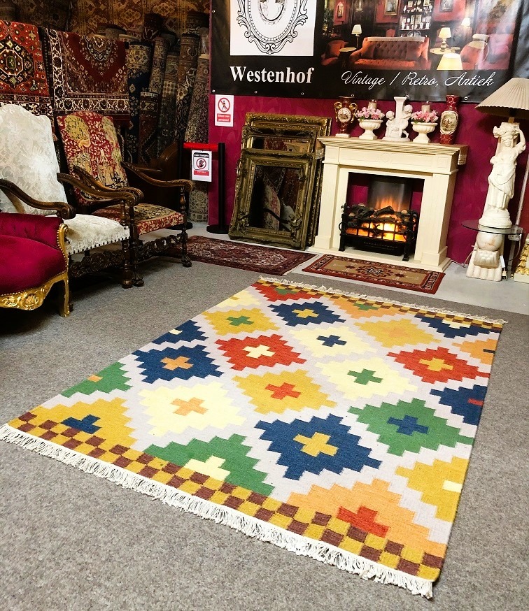 Zeer mooi; zo goed als nieuw, origineel handgeweven vloerkleed kelim tapijt. Materiaal: gemaakt van wol.