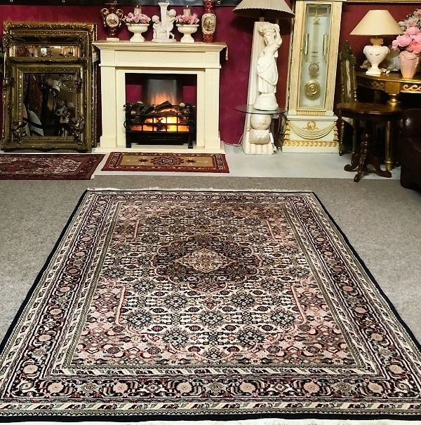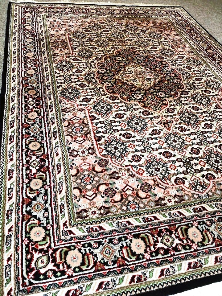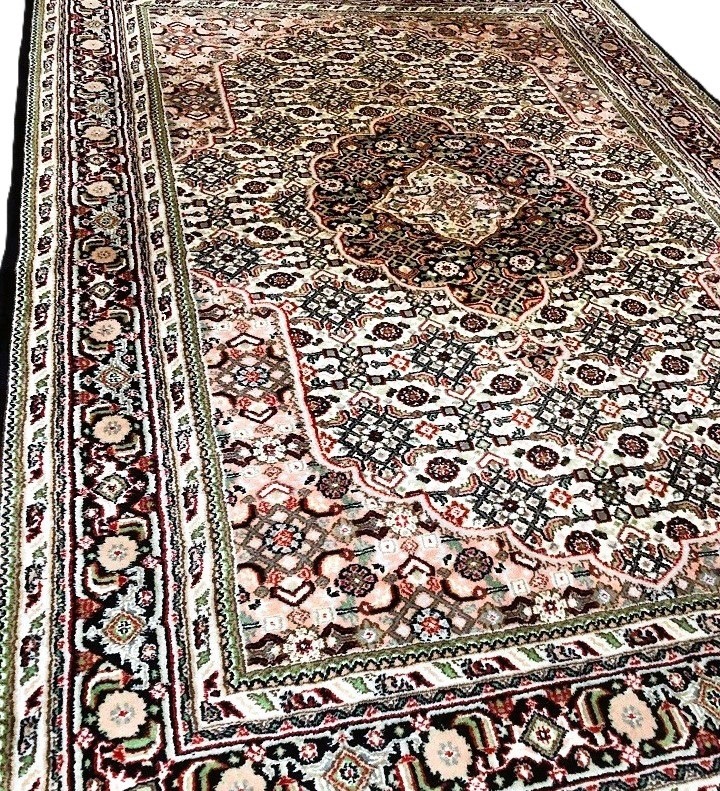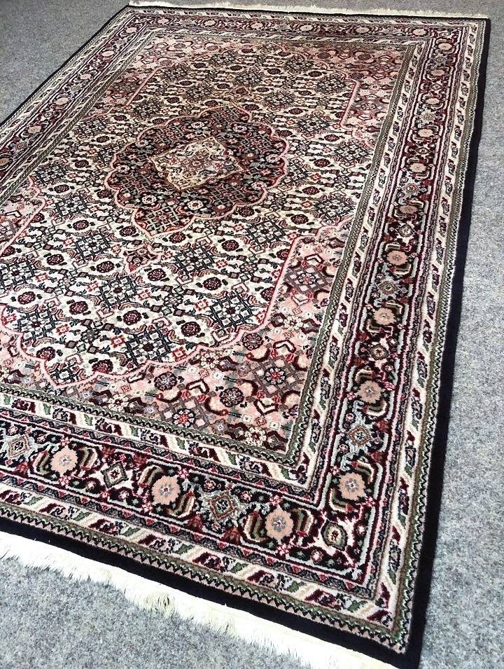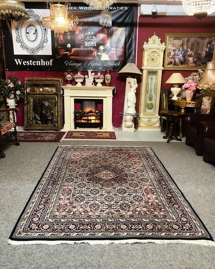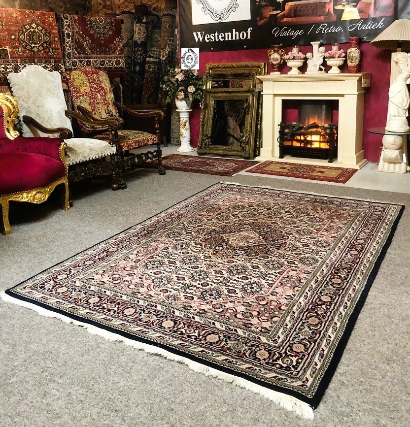 Prachtig Oosterse vloerkleed, kostbare Bidjar origineel fijn handgeknoopt Perzisch tapijt. Materiaal: gemaakt van wol. Kleur: oud roze, creme met groen en diep donkerblauwe rand, klassiek / antieke bloemenmotief / patroon. Conditie: in goede staat, huisdiervrij en rookvrij. Maat: 250x170 cm.