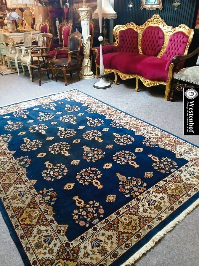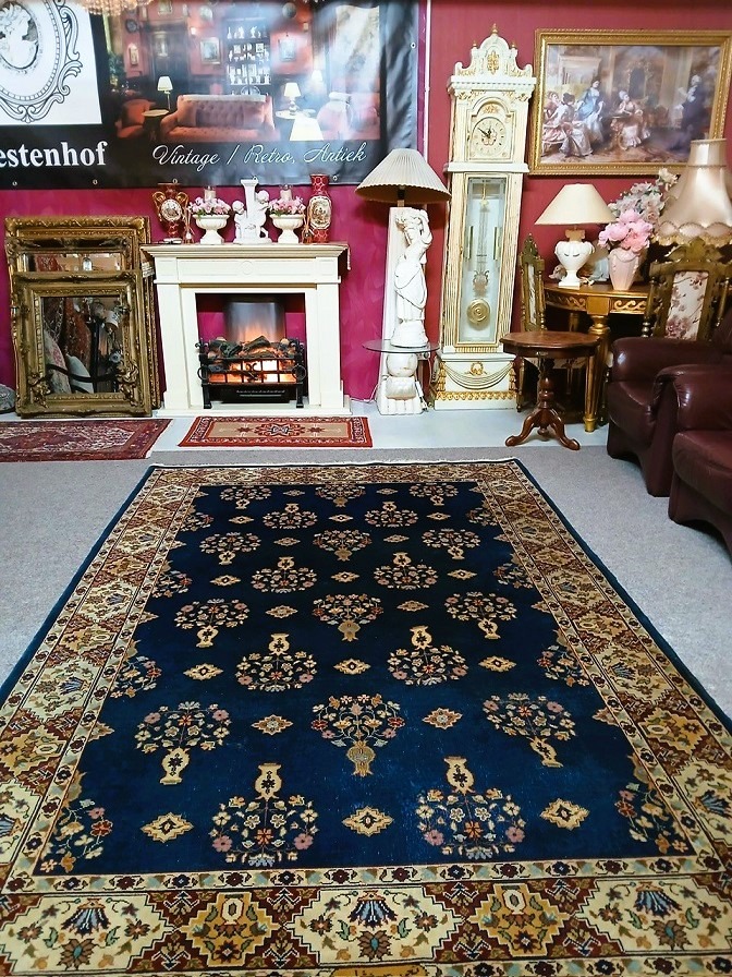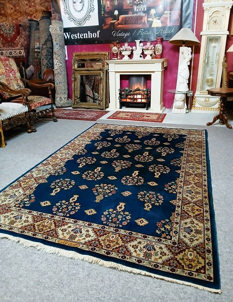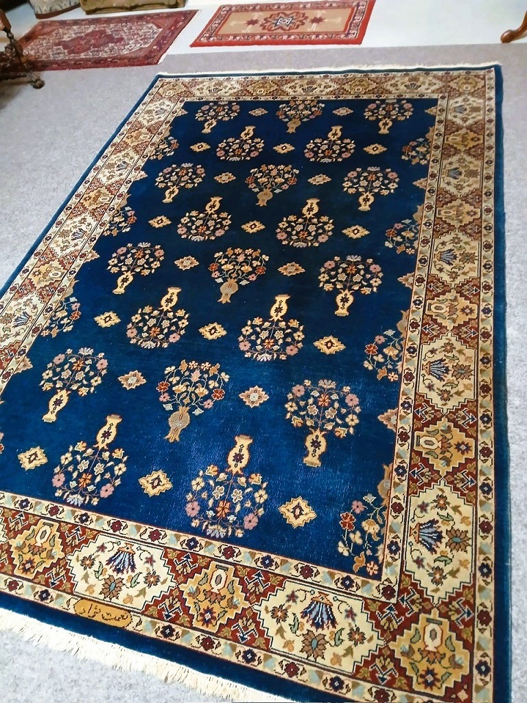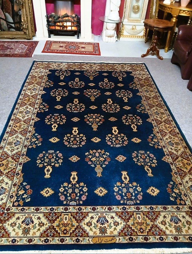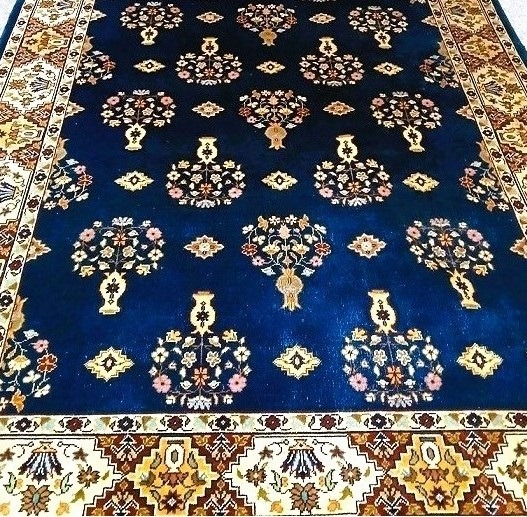 Mooie vintage Oosters vloerkleed zeldzaam, kostbare origineel zeer fijn handgeknoopt Perzisch tapijt Ghom / Ghoum zijde (Qom antique). Prachtig klassiek patroon met bloemen in vazen. Materiaal: gemaakt van wol / zijde. Herkomst: Perzië / Iran. Kleur: donkerblauw met diversiteit kleuren, crème, goud, rood enz. Huisdiervrij en rookvrij. Maat: 300x200 cm. Deze tapijt wordt afgeleverd met certificaat van echtheid.
