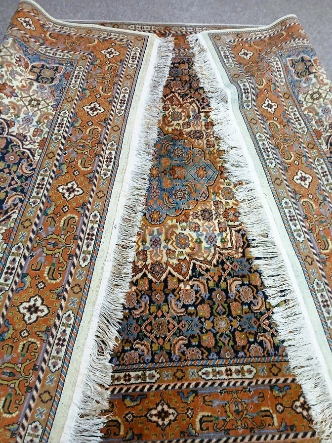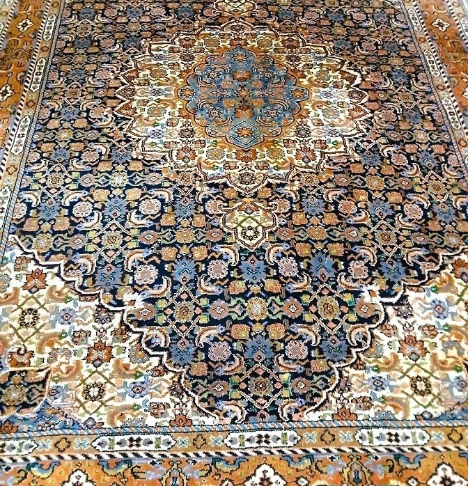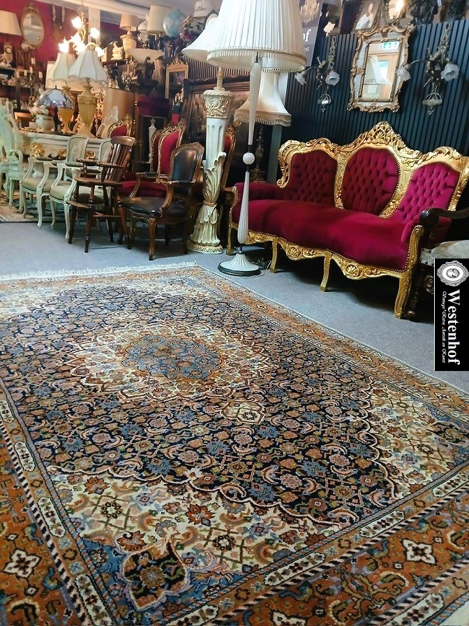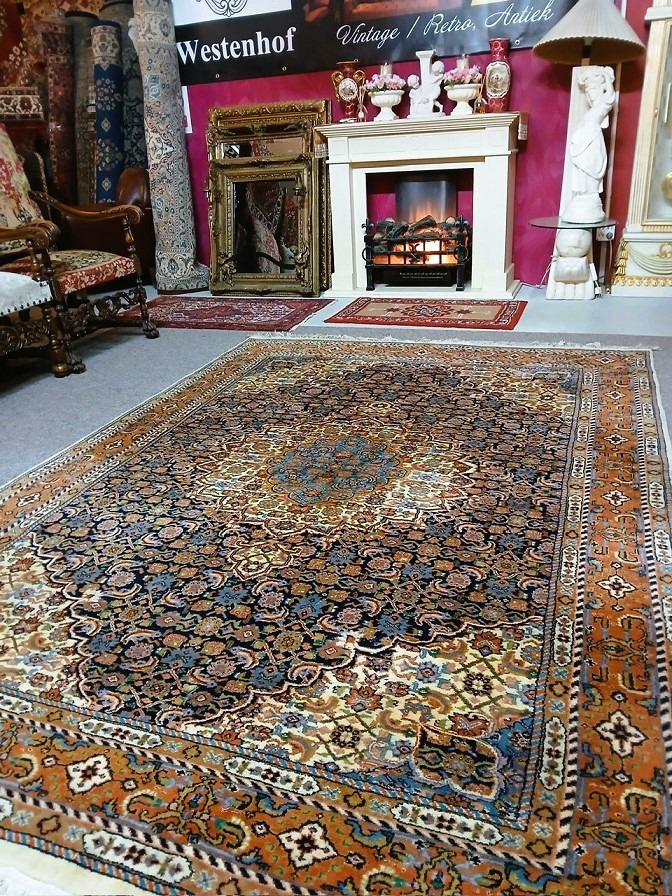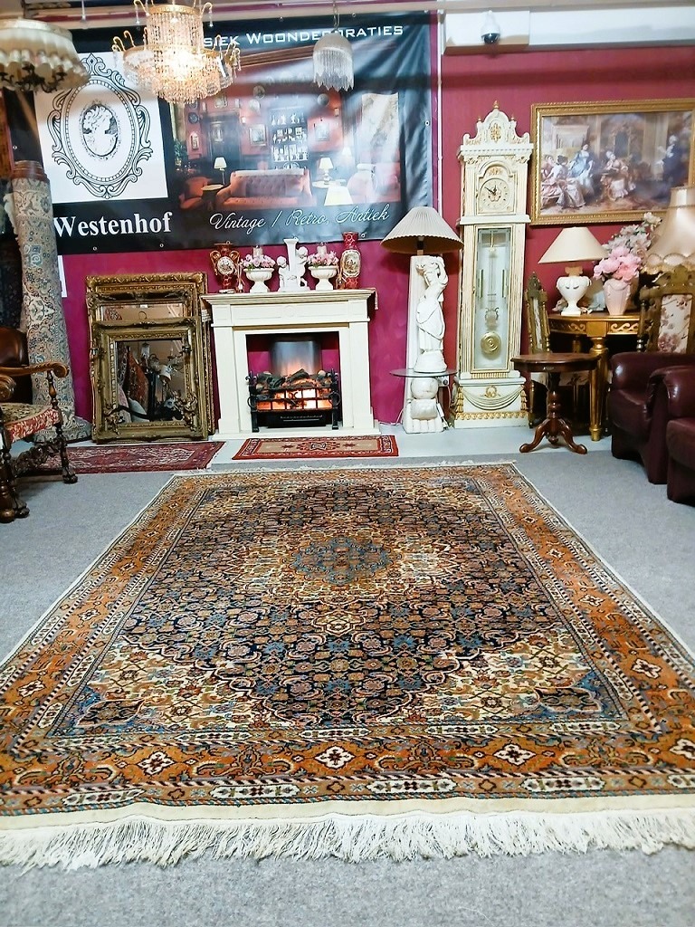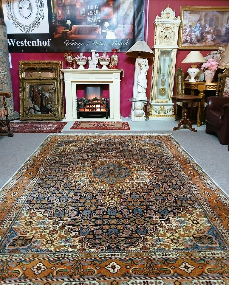 Zeer mooie vintage kostbare origineel fijn handgeknoopt Perzisch tapijt Bidjar Oosters vloerkleed zacht en dikke wol / 100%wol. Herkomst: Perzië /Iran. Kleur: oranje met creme donkerblauw en groen klassiek / antiek bloemenmotief / patroon. Conditie: in zeer goede staat / zo goed als nieuw, huisdiervrij en rookvrij.