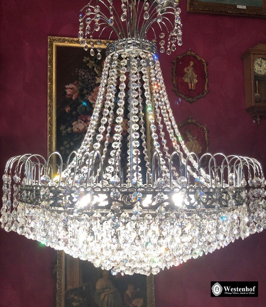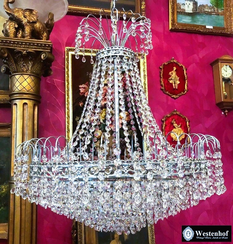 Mooie vintage klassiek kristallen kroonluchter swarovski zakkroonluchter zilverkleurig. Conditie: in goede staat, kristallen compleet en schoon, goedwerkend met 8 dunne fitting lampen. Doorsnede: 55 cm hoogte 60 cm zonder ketting en hoogte 80 cm incl. de ketting.