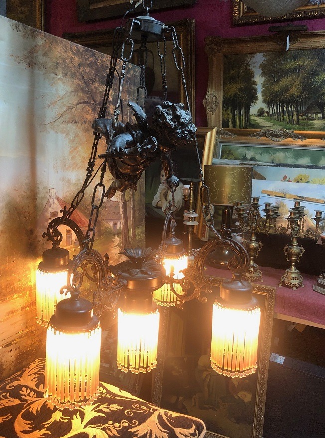 Prachtige antiek kroonluchter barok engel beeld zamak bronskleurig met 5 armen en roze pegels / glazen staafjes. Conditie: in goede staat en goed werkend met dikke fitting lampen. Afmetingen: dia. 50 cm, hoogte 90 cm (incl. de ketting).