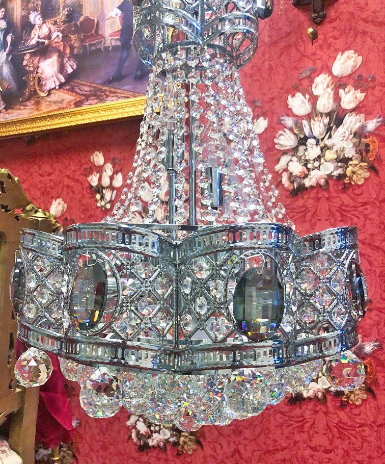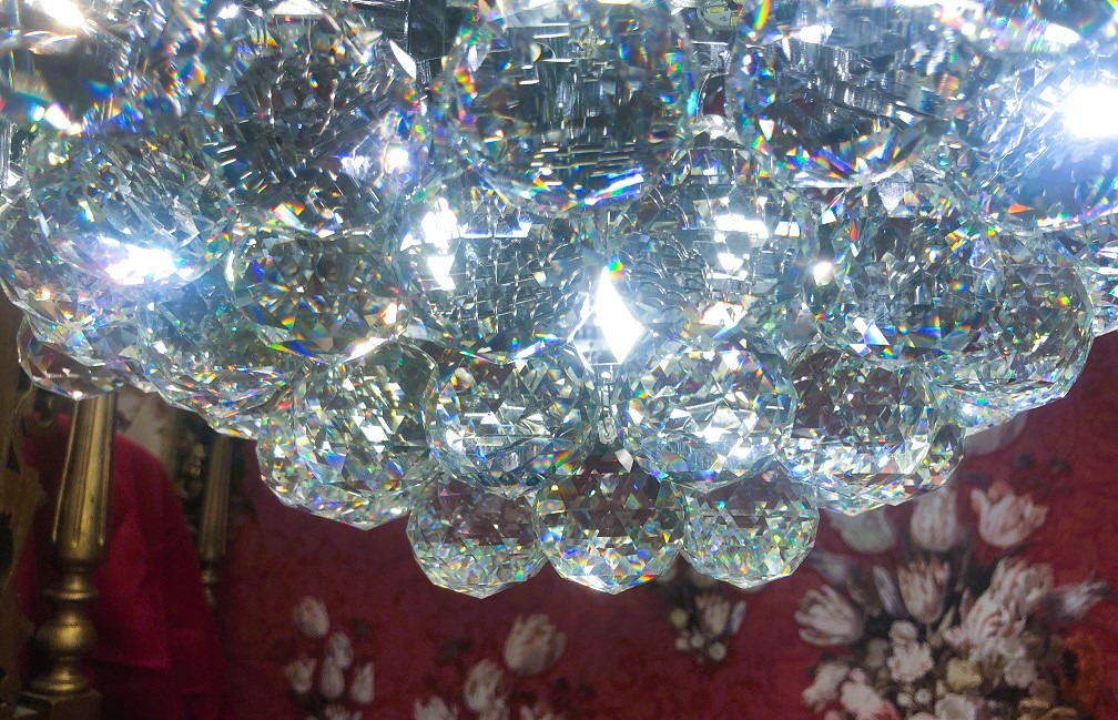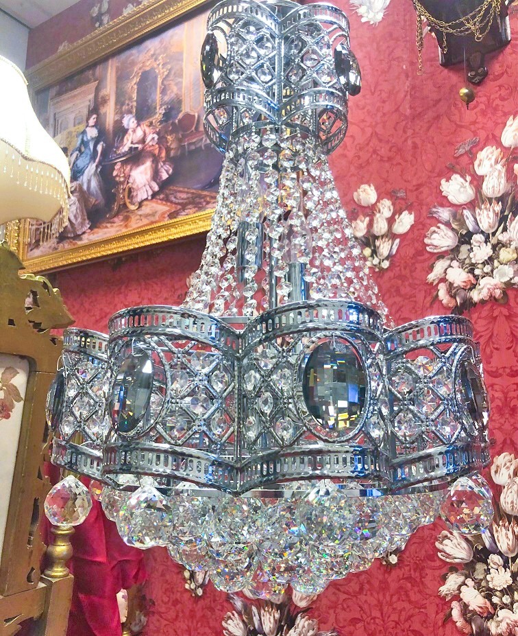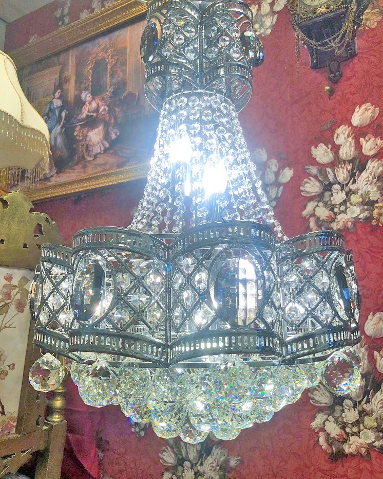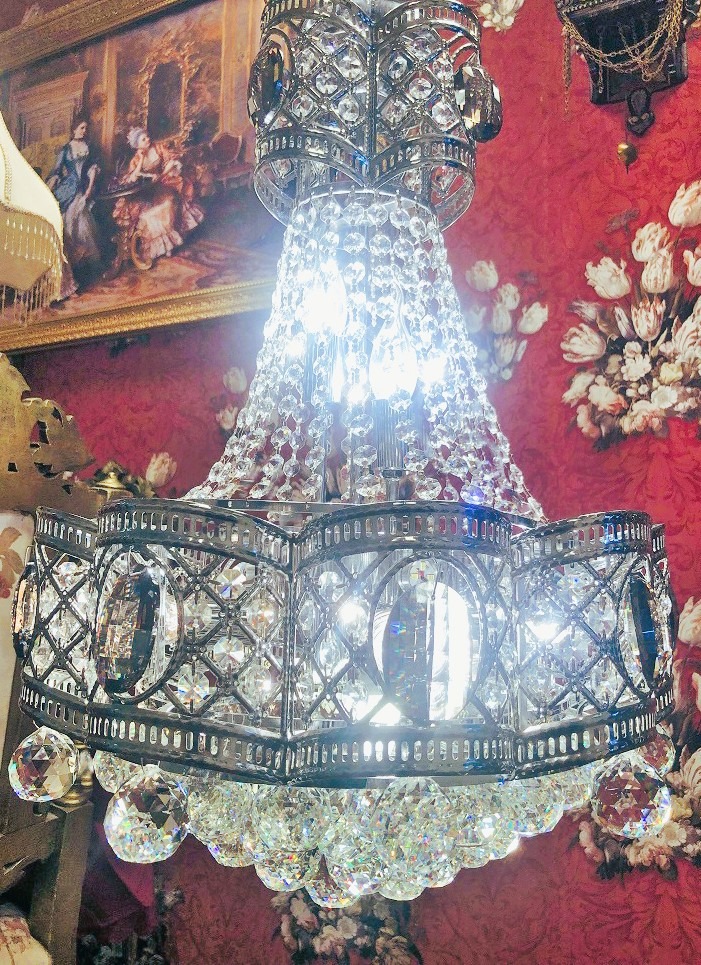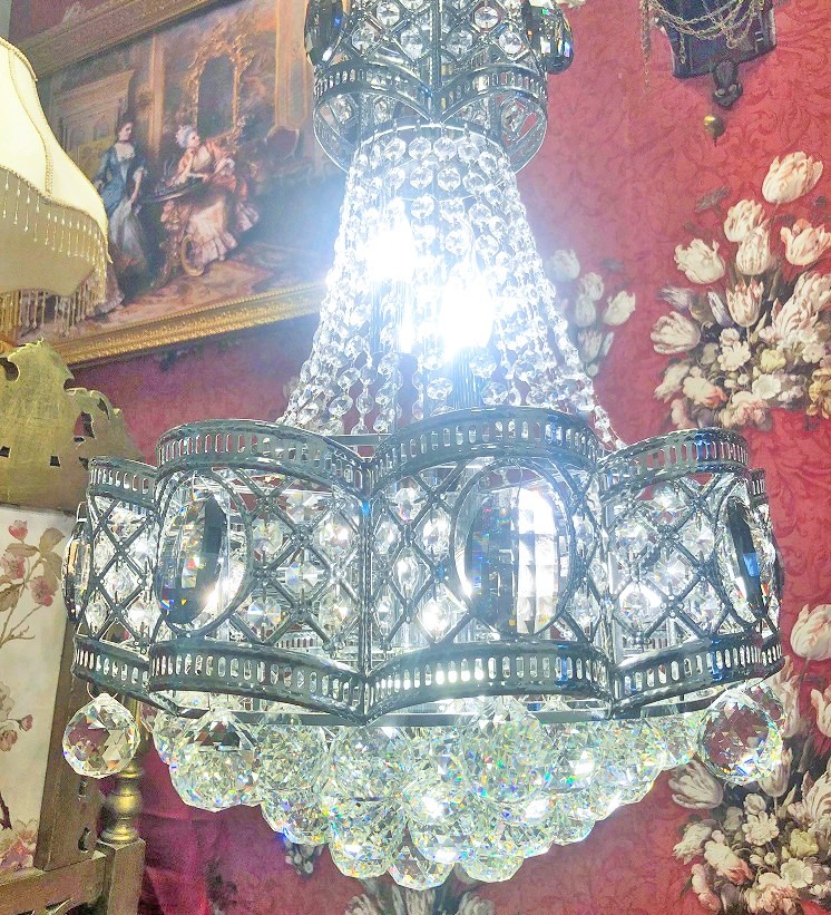 Zeer mooie kristallen kroonluchter / zakkroonluchter zilverkleurig met swarovski bollen. Conditie: in zeer goede staat en goedwerkend met dunne fitting lampen. Doorsnede: 47 cm hoogte 75 cm zonder ketting.