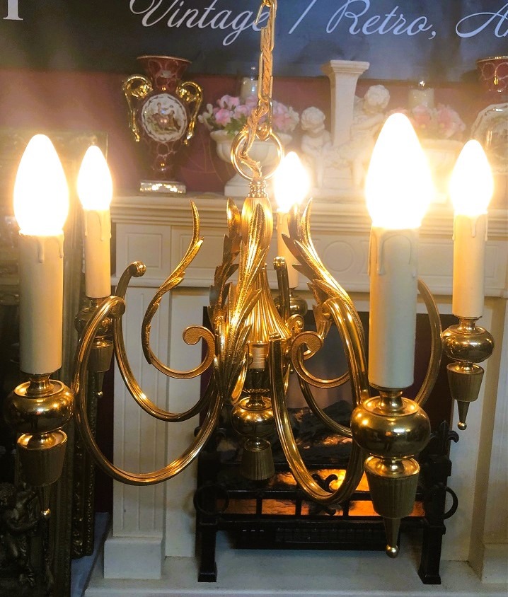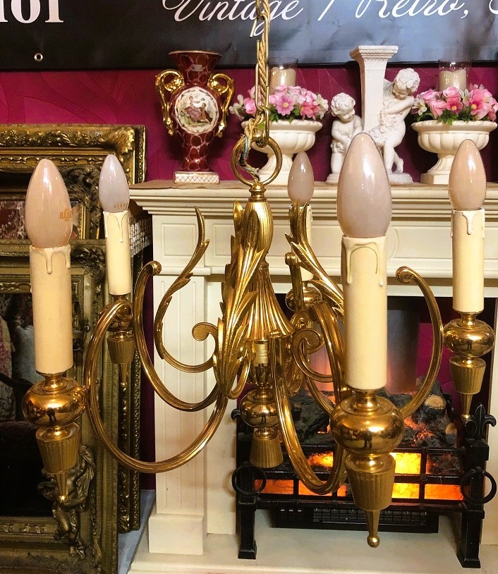 Mooie antiek barok kroonluchter messing goud verguld met 5 arms kandelaar / kaarsen lampen. Afmetingen: breedte 45 cm, hoogte 80 cm (incl. de ketting).