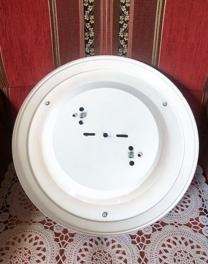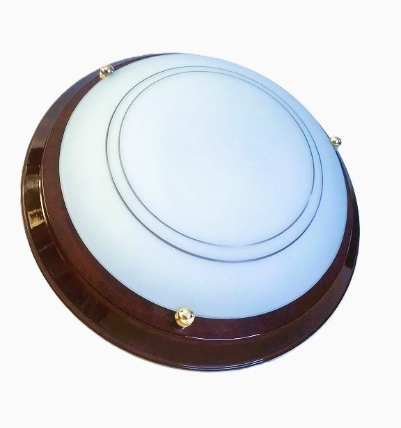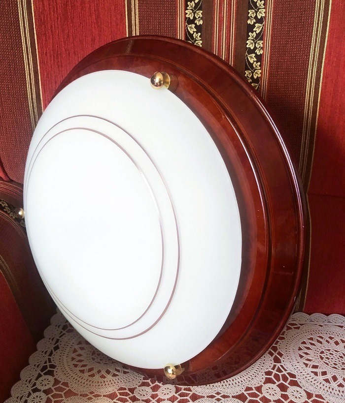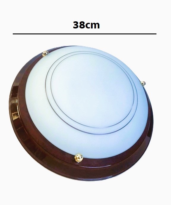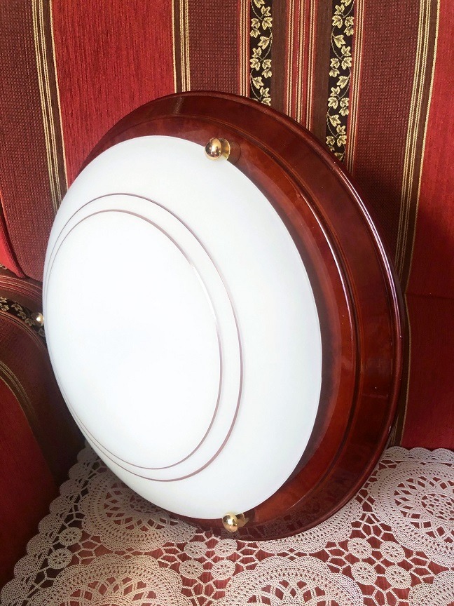 Vintage plafondlamp / plafonniere klassiek, metalen rand / ring, rood bruin met glazen kap wit en 3 knopen goud, werkt met 2 dikke fitting lampen. Afmetingen: diameter: 38 cm.