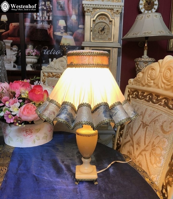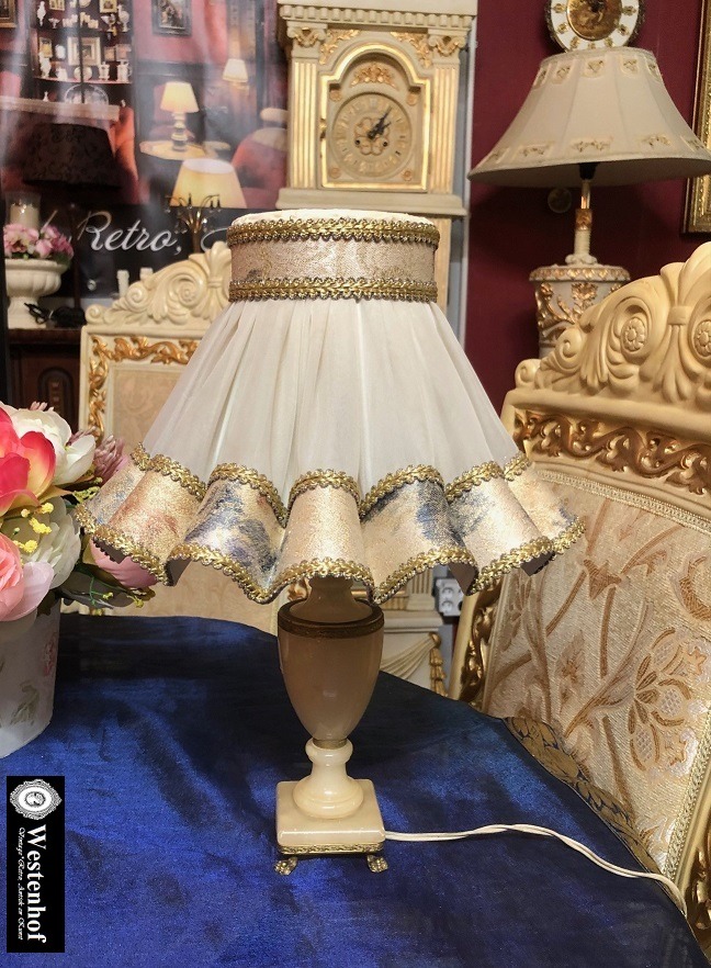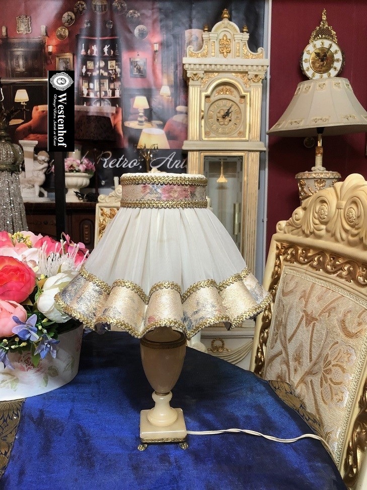Prachtige antiek brocante tafellamp met onyx stenen lamp voet en klassiek lampenkap stof creme met gouden rand. Conditie: in goede staat voor zijn leeftijd. Afmetingen: hoogte 36 cm, lampenkap dia. onderkap 27 cm