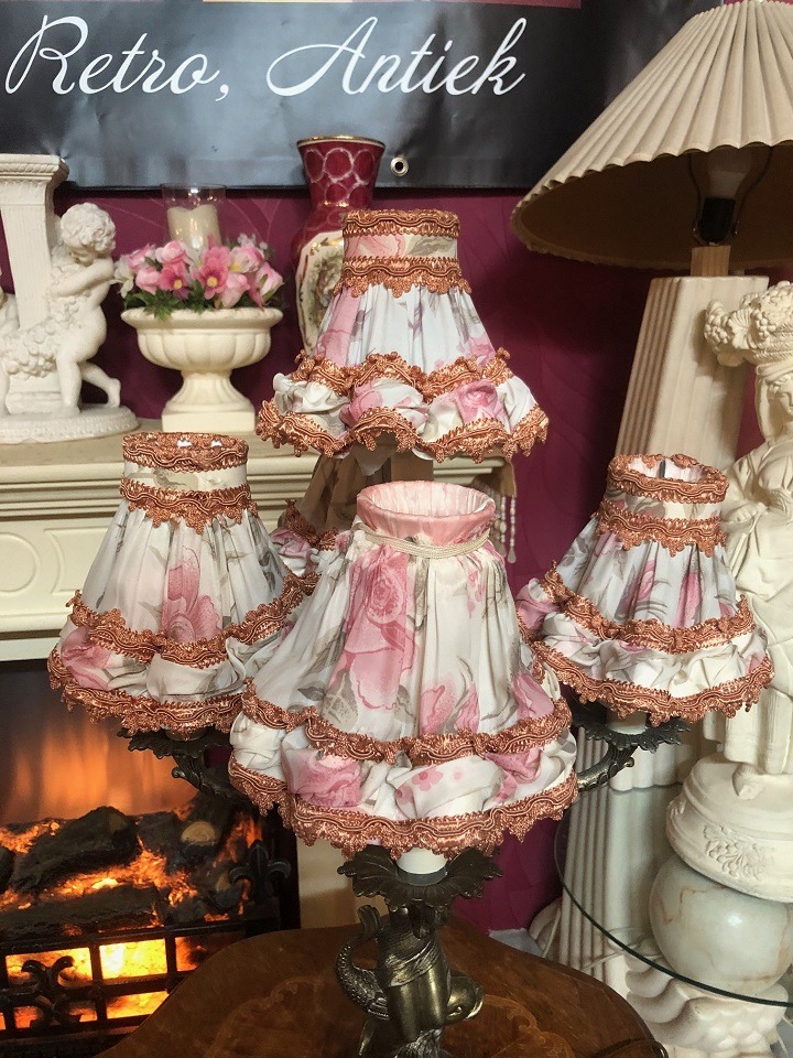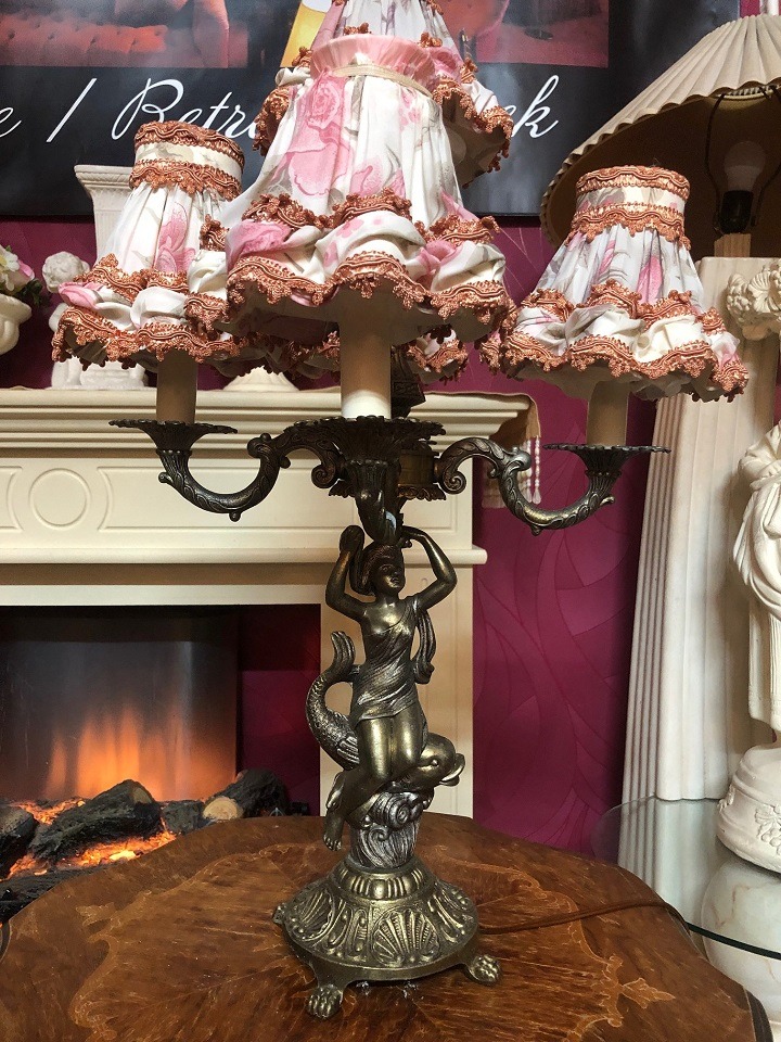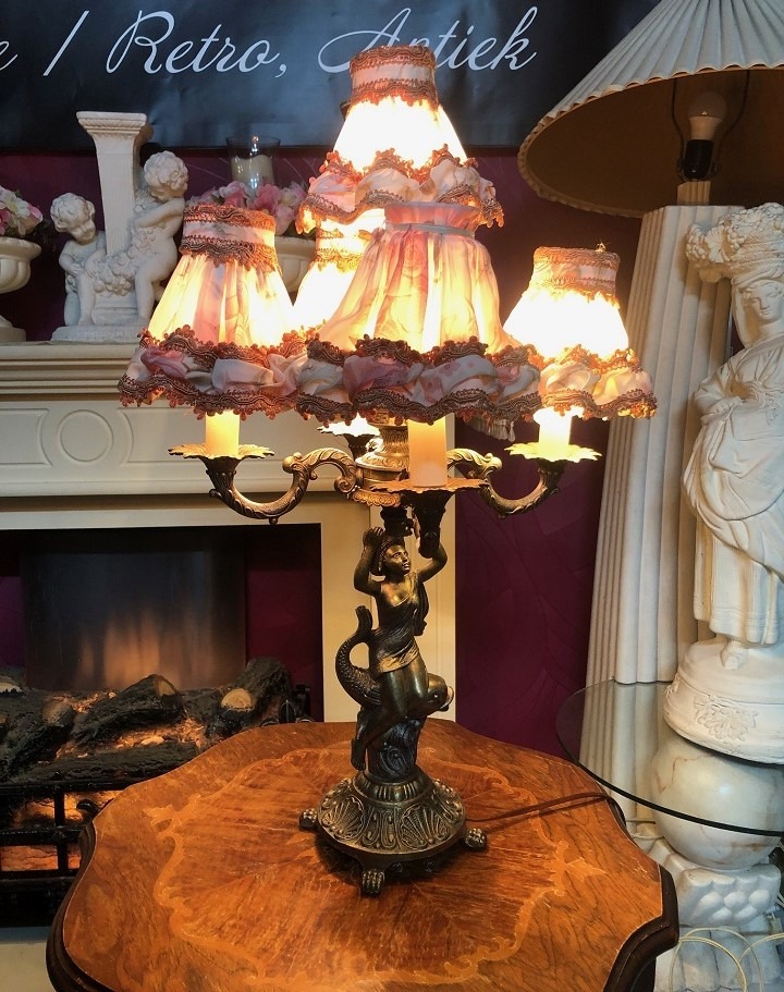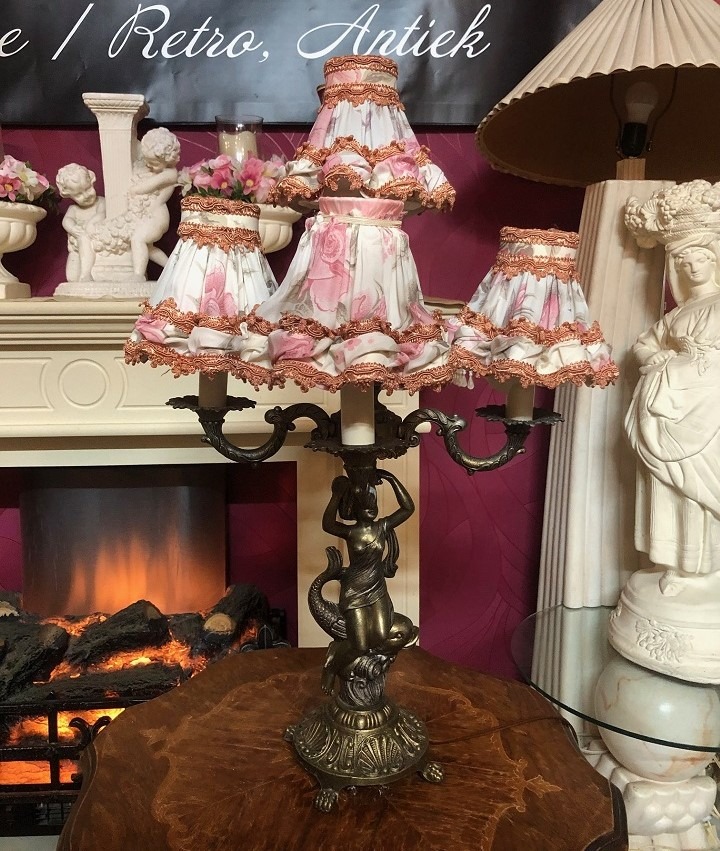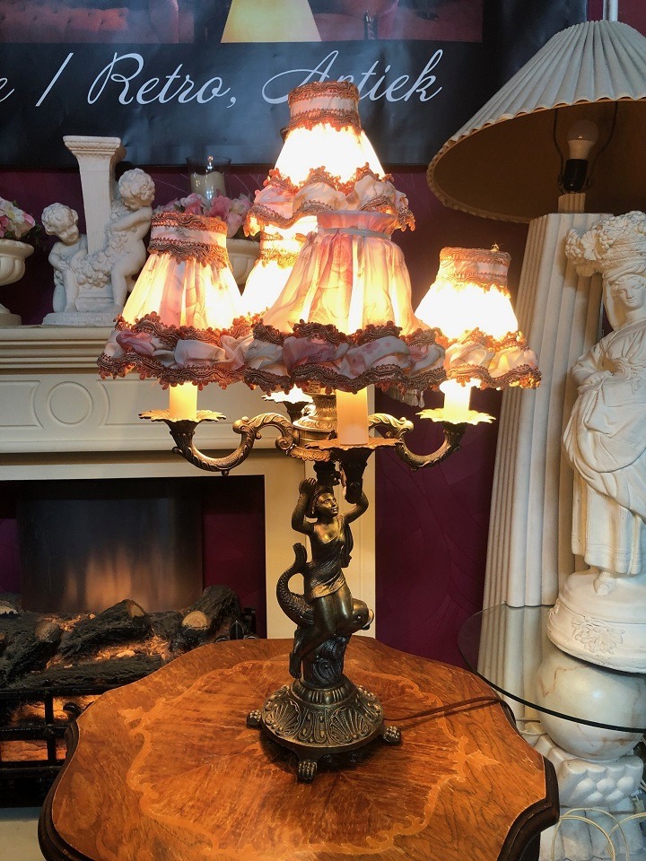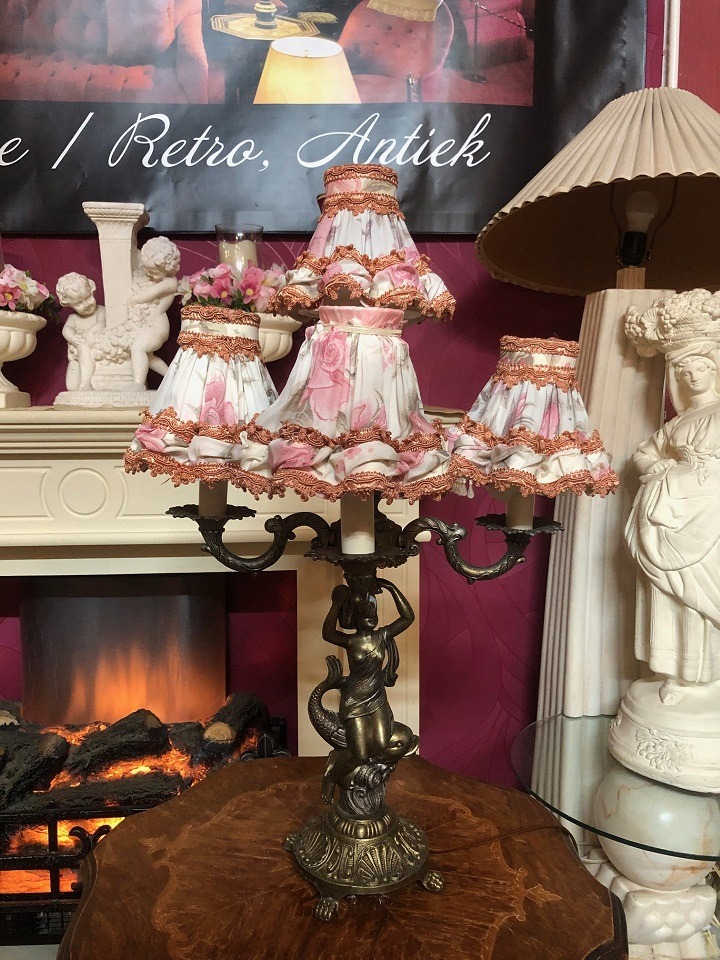 Prachtig antieke koperen tafellamp / staandelamp met beeld, 5 arms lampen en stoffen klassiek lampenkapjes oudroze met rozen bloemen patroon. Afmetingen: breedte 45 cm, breedte 70 cm