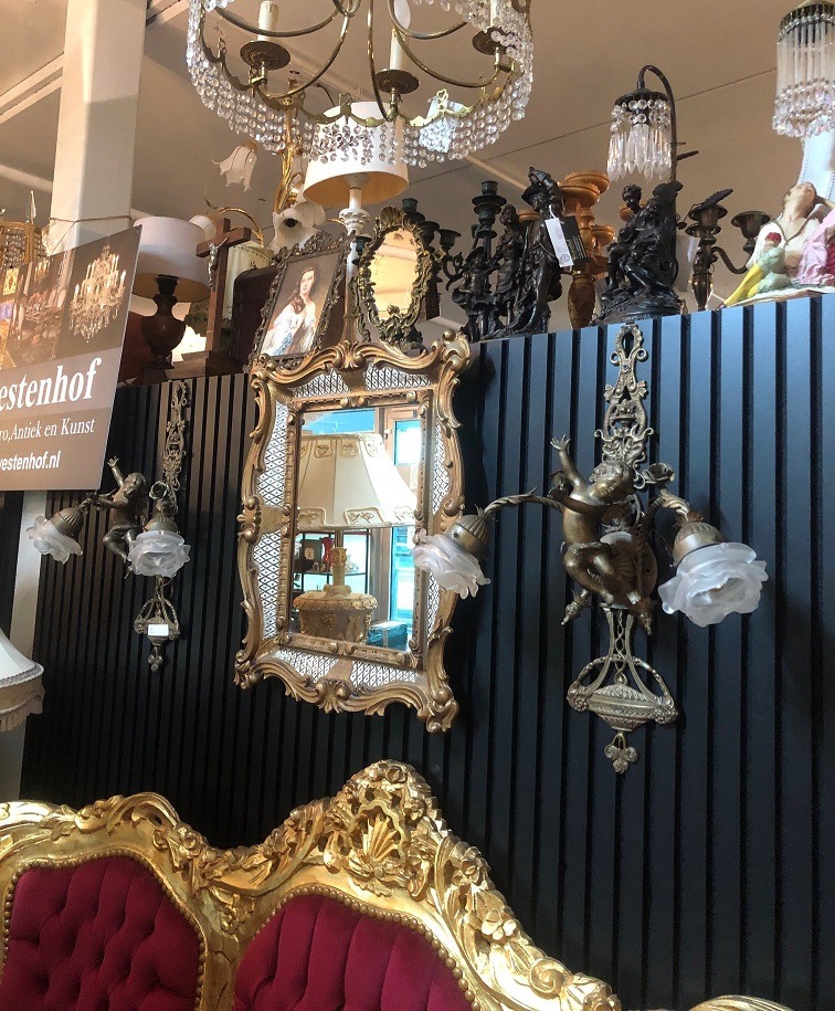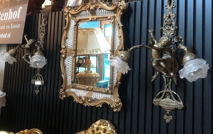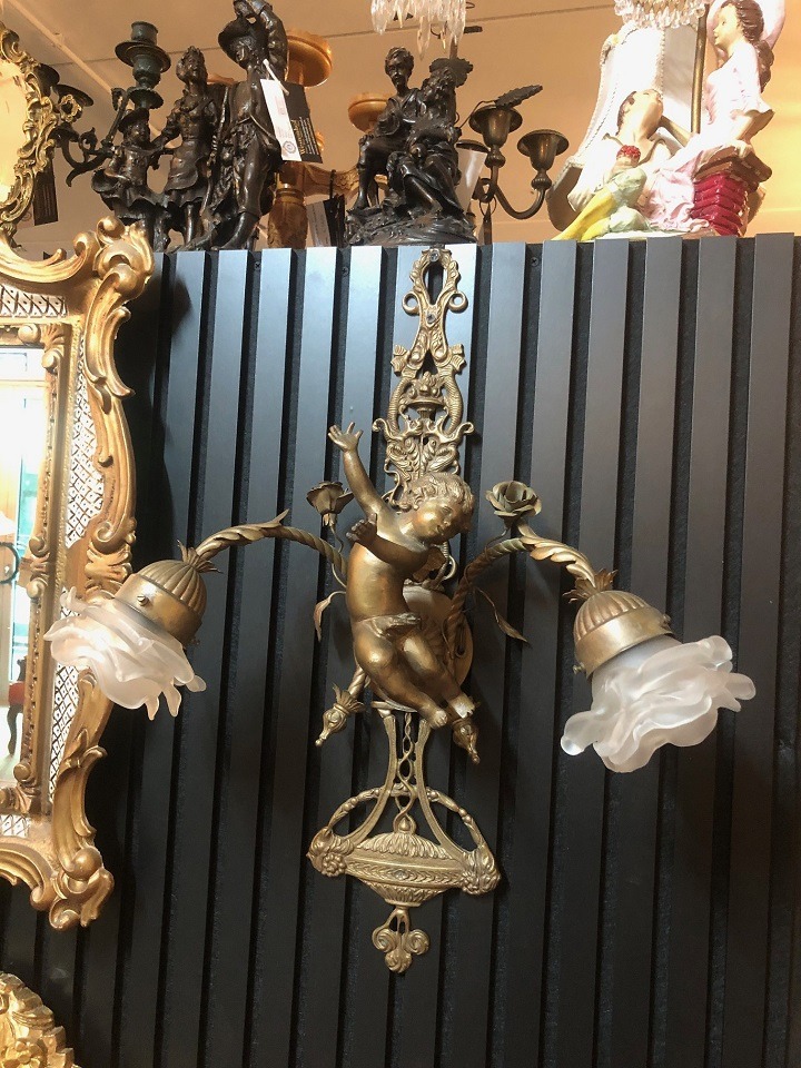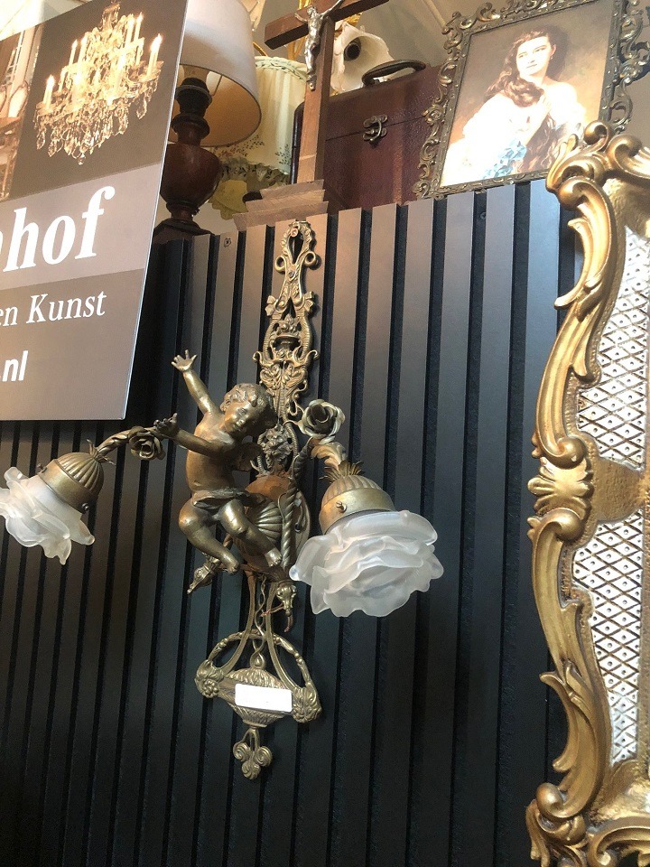 Prachtige set van 2 st. antiek zware wandlampen barok engelen beelden brons / goudkleurig met 2 rozen / bloemen lampkapjes glas - wit. Conditie: ze zijn in goede staat en goed werkend met dunne fitting lampen. Afmetingen: hoogte 60 cm, breedte 48 cm