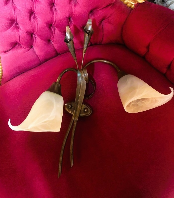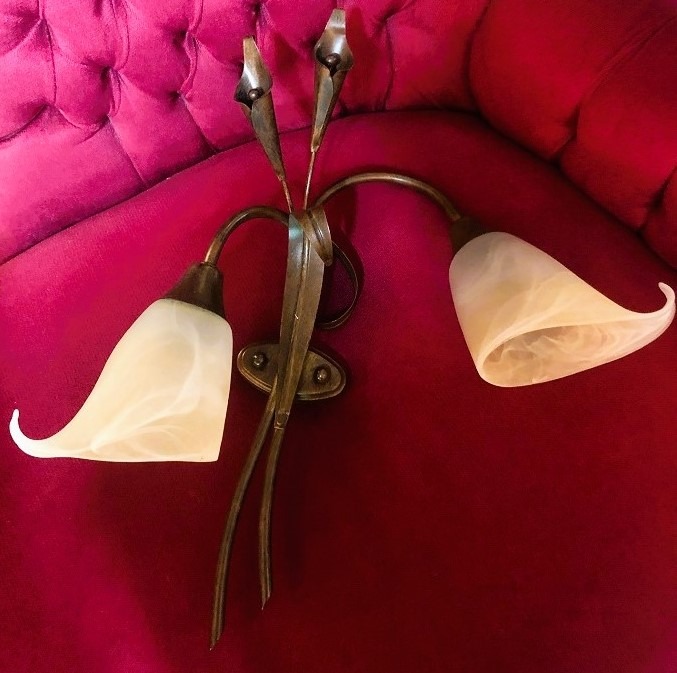 Mooie vintage / art deco Italiaanse wandlamp 2 arms metaal bronskleurig met dikke glazen lampenkapjes creme bloem vorm. Conditie: in goede staat, goed werkend met dunne fitting lamp. Afmetingen: Hoogte 48 cm, lampenkap dia. 15 cm