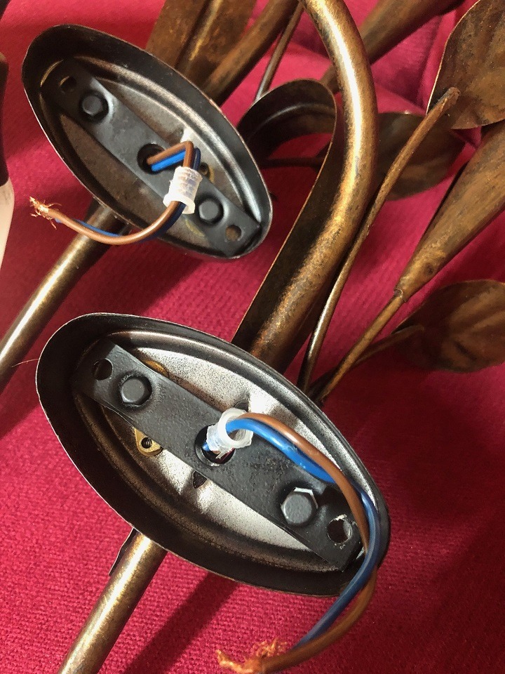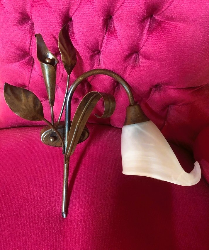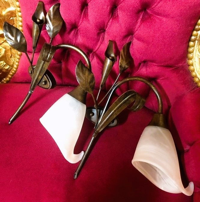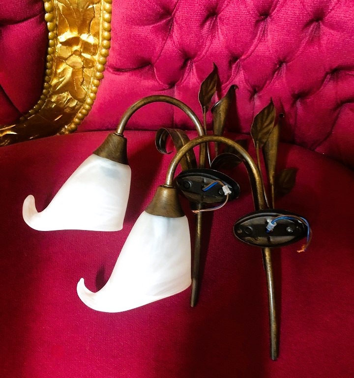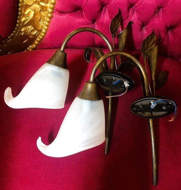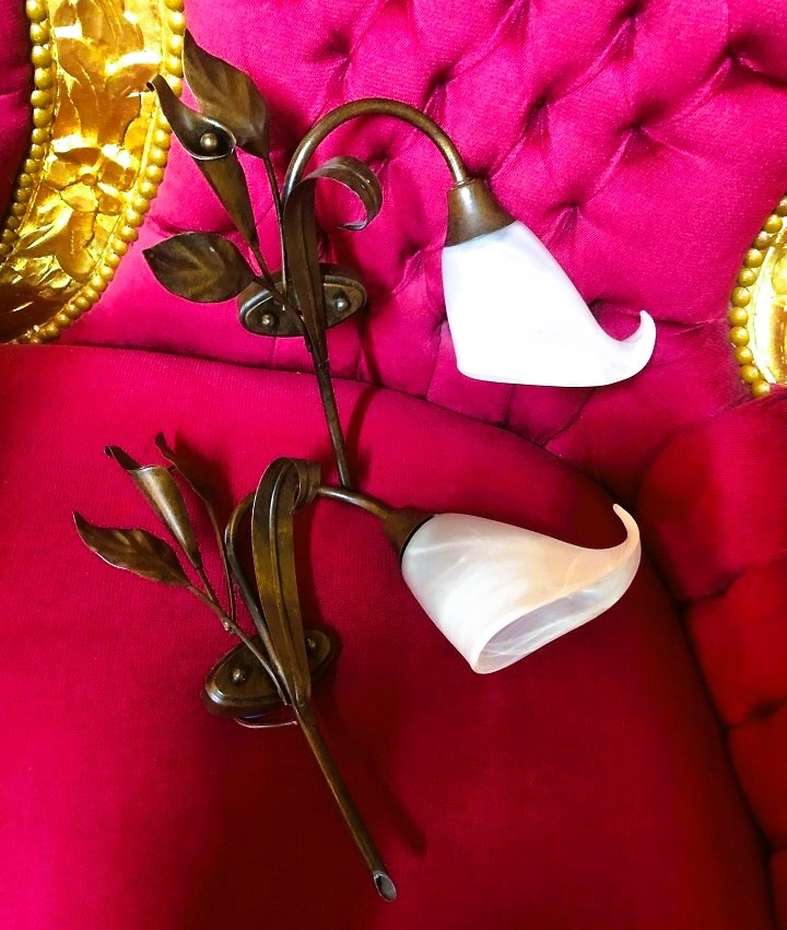 Mooie set vintage / art deco Italiaanse wandlampen 2 st. bronskleurig metaal met dikke glazen lampenkapjes bloemvorm. Conditie: in goede staat, goed werkend met dunne fitting lamp. Afmetingen: Hoogte 35 cm, lampenkap dia. 15 cm