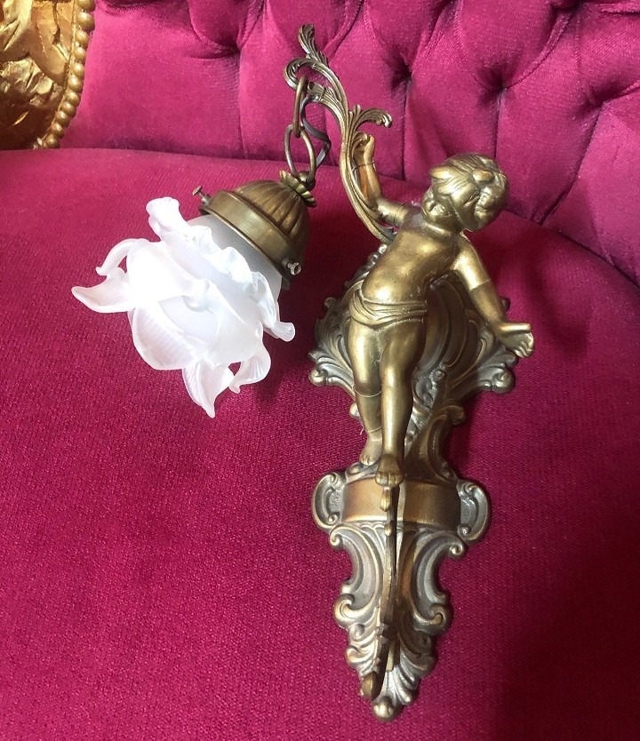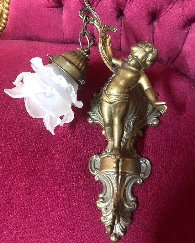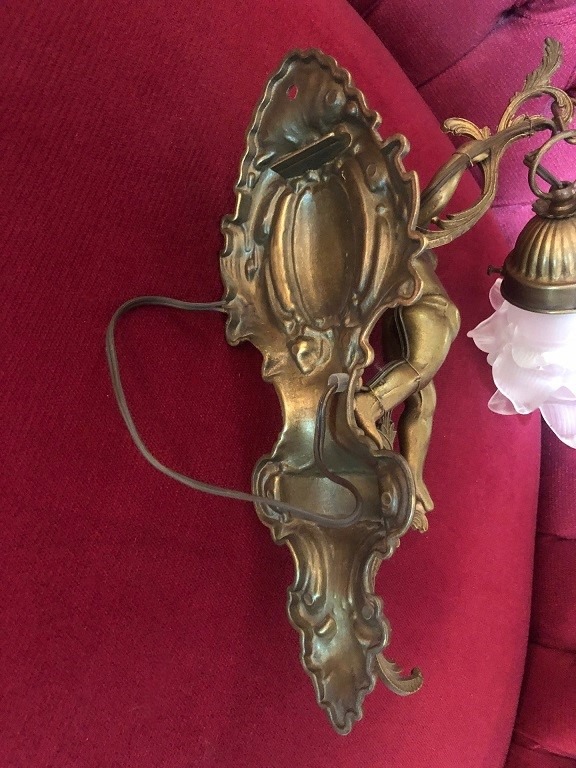 Prachtig antieke wandlamp barok engel beeld brons met glazen lampenkapje bloem-roosvorm wit. Conditie: in goede staat en goed werkend met dunne fitting lamp. Afmetingen: hoogte 35cm x breedte (zie foto).